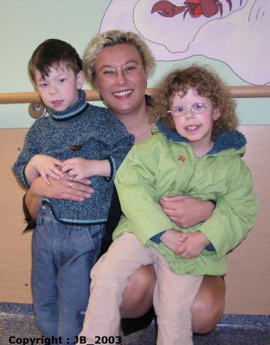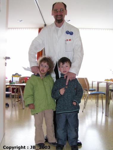 Im April 2003 war es dann mal wieder soweit : Zur Entwicklungsdiagnostik war ein erneuter Besuch bei Herrn Dr.Pankau und Frau Dr.Gosch geplant. Seit unserem letzten Besuch war Herr Dr. Pankau mit der Kinderklinik von Wittenberge in einen Neubau nach Perleberg umgezogen. Nach 6 Stunden Fahrt war der Empfang genauso herzlich wie im Jahre 2001 in Wittenberge. Uns ging es in diesem Fall hauptsächlich um die Entwicklungsdiagnostik von Frau Dr.Gosch, besonders hinsichtlich der Tatsache, dass der Termin für die Schulanmeldung näher rückte. Das Gutachten ergab, dass Bianca (zu dem Zeitpunkt fast fünf Jahre alt) sich ungefähr auf dem Niveau eines drei- bis dreieinhalbjährigen Kindes bewegte und - besonders aus konstitutionellen Gründen - eine Rückstellung vom Schulbesuch bis 2005 durchaus ratsam wäre. Bei diesem Besuch lernten wir auch Lukas kennen, der sich zum selben Termin zusammen mit seinem Bruder und seinen Eltern in der Klinik aufhielt. Die Kinder hatten ihren Spass zusammen und wir Eltern hatten auch etwas Abwechslung.